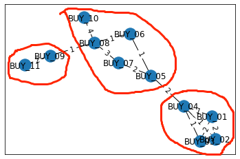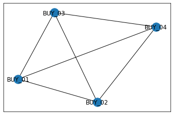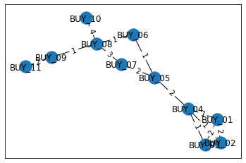 G.add_edge('BUY_04','BUY_05',weight=2)G.add_edge('BUY_05','BUY_06',weight=1)G.add_edge('BUY_05','BUY_07',weight=2)G.add_edge('BUY_06','BUY_08',weight=1)G.add_edge('BUY_07','BUY_08',weight=3)G.add_edge('BUY_08','BUY_09',weight=1)G.add_edge('BUY_08','BUY_10',weight=4)G.add_edge('BUY_09','BUY_11',weight=2)pos=nx.spring_layout(G)labels = nx.get_edge_attributes(G,'weight')nx.draw_networkx(G,pos)nx.draw_networkx_edge_labels(G,pos,edge_labels=labels)