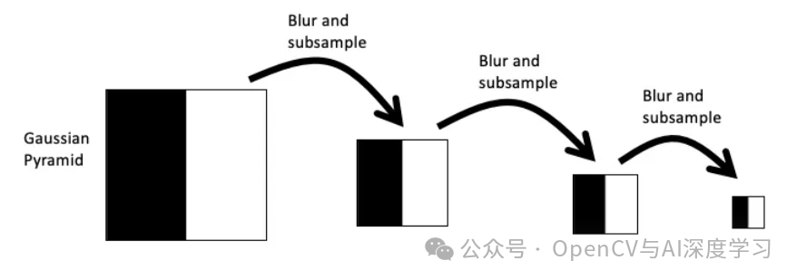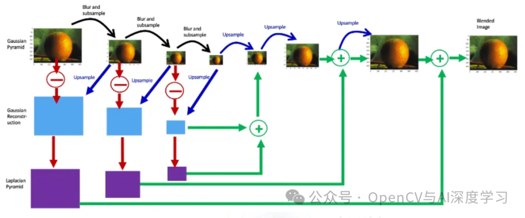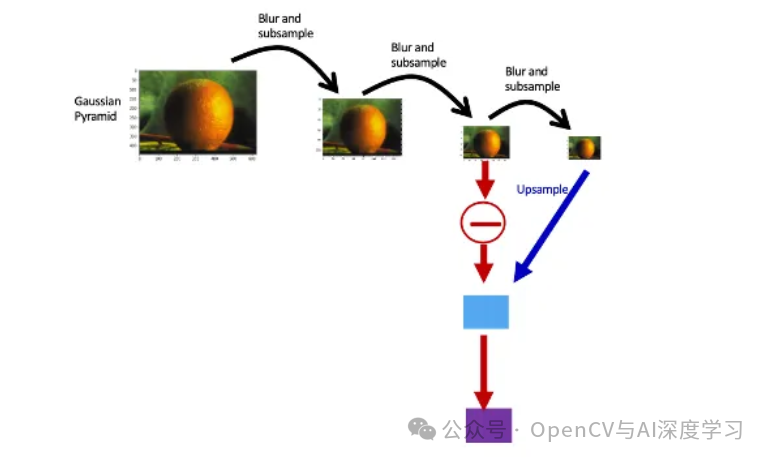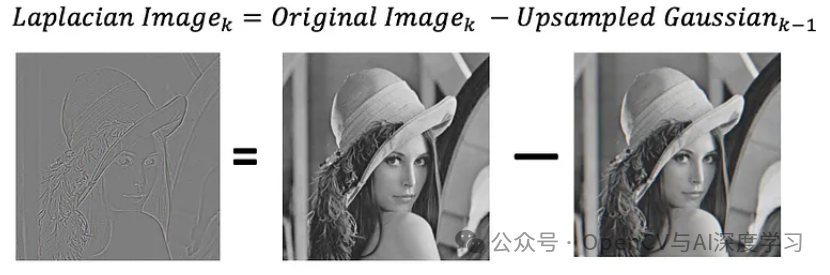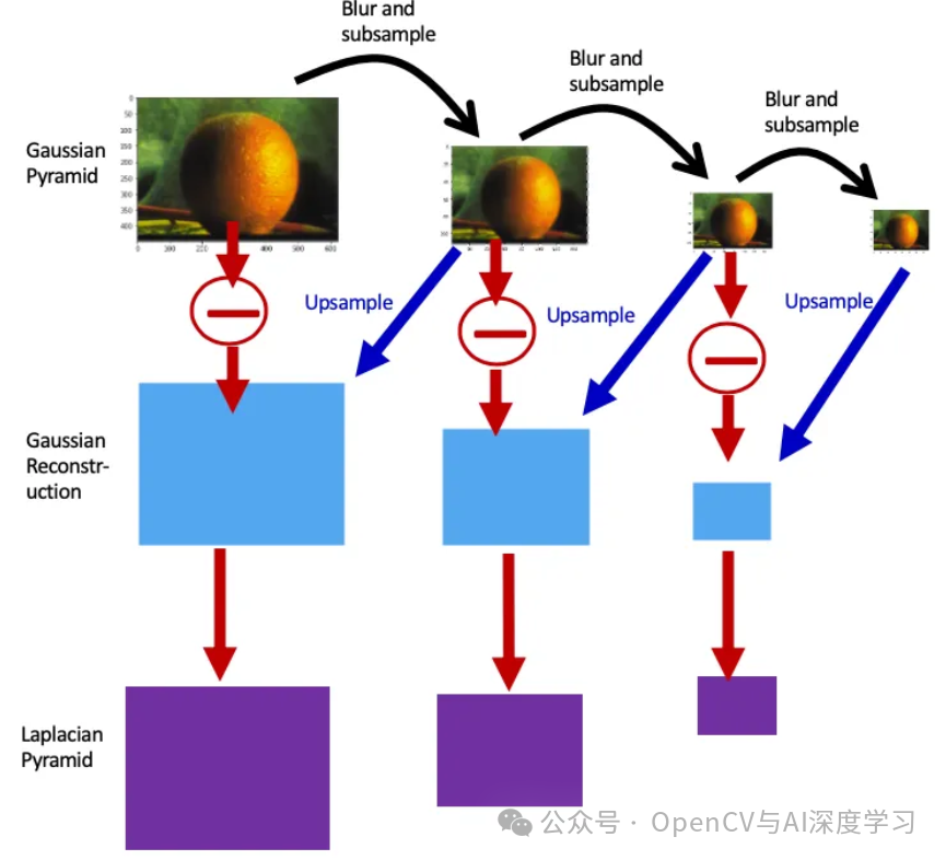 为了执行卷积,我们在每个像素上应用此卷积运算,并根据需要使用镜像或零填充。 使用高斯金字塔,在每个尺度上,图像尺寸减小 2 倍,而所应用的聚合高斯平滑滤波器的尺度增加 2 倍。简单地说,金字塔的每一层,图像都会变得更小、更模糊。 接下来,我们构建拉普拉斯金字塔。为了在给定级别 i 构建拉普拉斯,我们首先从高斯金字塔中对下一个最小级别的缩小图像进行上采样。我们从当前级别的高斯金字塔中的图像中减去上采样的图像。 为了对较小的图像进行上采样,我们使用插值进行上采样,即先上采样再进行滤波。以 2 倍的倍数进行上采样会在原始图像的每个像素之间插入 1 个零。然后我们使用高斯滤波器对该图像进行低通滤波,以消除上采样插入的图像伪影和异常。然后,我们从高斯金字塔中当前比例的图像中减去上采样后的图像(蓝色框)。这些图像在上采样后将具有相同的大小,结果就是当前比例的拉普拉斯算子。