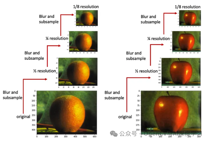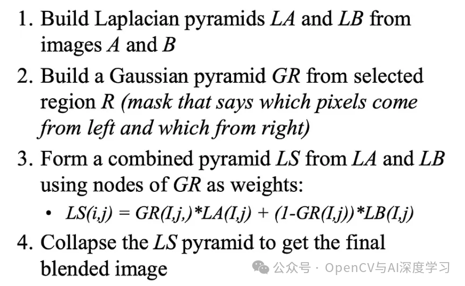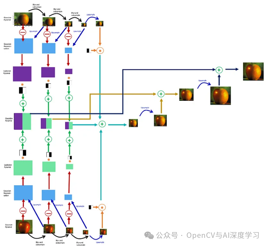 拉普拉斯算子本质上是一个高通滤波器。它只捕捉图像的细节和边缘。直观地,我们可以想象,从有细节的图像中减去没有细节的平滑图像,将只留下细节。 对于苹果和橙子这两幅输入图像,我们必须构建一个拉普拉斯金字塔。然后,我们为蒙版构建一个高斯金字塔。 将高斯滤波器应用于子采样蒙版可使图像混合变得平滑。蒙版有助于我们将两个输入的拉普拉斯金字塔组合起来。使用 alpha+(1-alpha) 组合,在每个尺度上,我们将蒙版乘以图像 A 的拉普拉斯,然后将图像 B 的拉普拉斯乘以 (1-mask) 并将两者相加。