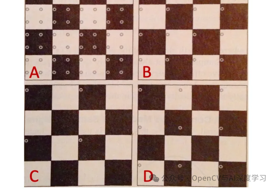拉普拉斯金字塔建立在高斯金字塔的基础上。高斯金字塔用于表示不同比例下的信息(在本例中为图像),每个比例下原始图像的信息都得以保留。简而言之,高斯金字塔是一系列图像,从原始图像开始,原始图像缩小 1/2,原始图像缩小 1/4,依此类推。在金字塔的每次转换中,我们都希望将图像缩小 1/2。 为了将图像比例缩小 1/2,高斯金字塔将平滑与下采样相结合。首先,使用高斯滤波器对图像进行平滑处理,然后下采样 1/2。要下采样 1/2,只需在每行和每列中每隔一个像素取一个即可。 你可能会问自己,为什么不直接将采样率降低 1/2,并跳过平滑步骤呢?这仍然会导致图像缩小 1/2。然而,问题在于混叠。 当通过跳过像素进行下采样时,可能会丢失图像中的重要信息。具体来说,根据您下采样的粒度,您可能会丢失所有对比度区域。以下图为例。在棋盘 A 和 B 中,下采样发生的频率足够高,因此图案得以保留。然而,在棋盘 C 中,下采样的频率变得太低,采样图像全黑。在棋盘 D 中,下采样图像根本不能代表原始棋盘图案。 平滑可降低图像特征的最大频率,并减少仅使用子采样会遗漏的强烈对比和快速变化。通过将图像与高斯滤波器进行卷积来对图像进行高斯平滑本质上是对图像执行低通滤波。对图像进行低通滤波的目的是保留图像中的低频信息(例如低对比度位置),同时减少高频信息(例如边缘)。平滑会去除边缘!