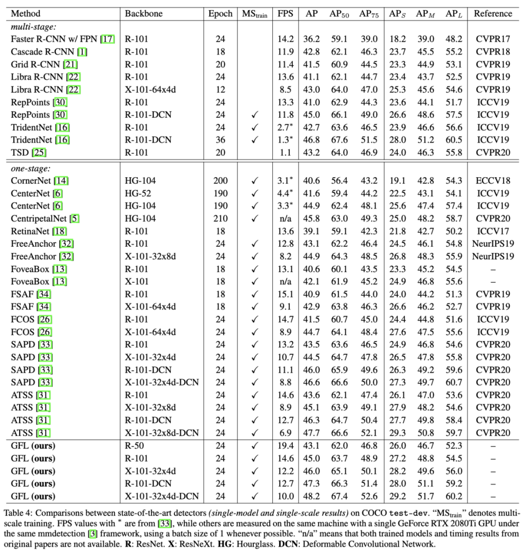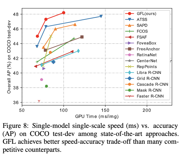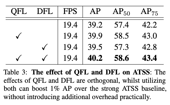 为了高效地学习准确的预测框及其分布,论文对Focal loss进行拓展,提出了能够优化连续值目标的Generalized Focal loss,包含Quality Focal loss和Distribution Focal loss两种具体形式。QFL用于学习更好的分类分数和定位质量的联合表示,DFL通过对预测框位置进行general分布建模来提供更多的信息以及准确的预测。从实验结果来看,GFL能够所有one-stage检测算法的性能。