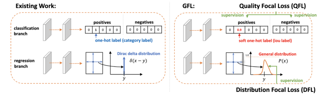 实际上,使用上述提到的两种策略会面临优化的问题。在常规的one-stage检测算法中,分类分支都使用Focal loss进行优化,而Focal loss主要针对离散的分类标签。在论文将定位质量与分类分数结合后,其输出变为类别相关的连续的IoU分数,不能直接使用Focal loss。所以论文对Focal loss进行拓展,提出了GFL(Generalized Focal Los),能够处理连续值目标的全局优化问题。GFL包含QFL(Quality Focal Los)和DFL( Distribution Focal Los)两种具体形式,QFL用于优化难样本同时预测对应类别的连续值分数,而DFL则通过对预测框位置进行general分布的建模来提供更多的信息以及准确的位置预测。