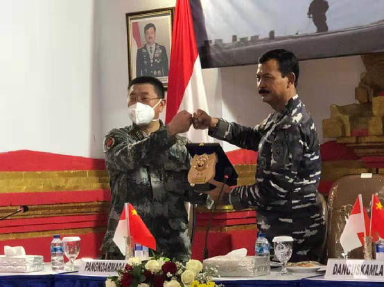 印尼军方在记者会现场展示的潜水艇残骸部件。来源:联合新闻发布会深圳卫视现场拍摄画面目前,编队已从水下目标勘察阶段转入打捞攻坚阶段。陈永靖强调,大深度水下打捞作业是世界性难题,“我们将根据水下目标状态结合编队实际能力,竭尽全力组织水下打捞作业”。联合发布会上,深圳卫视直新闻记者注意到,印尼第二海军舰队司令伊万少将向陈永靖赠送奖章以表示诚挚的谢意,双方还互相击拳以示互相信赖。“我们印尼海军非常荣幸与中国军方直接进行交流,机会很难得,特别是在当前Covid-19大流行的情况下。印尼海军将向中方赠送纪念奖章,以表示对中方协助的深深谢意,希望这种合作能够继续下去”。伊万少将表示,感谢中方所提供的人道主义援助,中国舰艇编队抵达之后与印尼军方保持了紧密的沟通协作,积极开展调查、勘测工作,表现出很高的专业能力与水平。伊万少将还高度评价了中方的深潜器,称其可以在深海区域进行清晰拍摄,极大地提升了水下勘测作业的效率。陈永靖则回应道,这是中国和印尼进行的一次重大人道主义救援行动,对巩固和深化两国全面战略伙伴关系,促进两军互信互助与合作意义重大。伊万少将与中国驻印尼武官陈永靖击拳以示互相信任。来源:联合新闻发布会深圳卫视现场拍摄画面值得注意的是,这是中国援潜救生力量首次投入国际救援实战。而出于高度的国际人道主义精神和基于“人类命运共同体”理念之下的道义准则,中国政府此次派出了高水平的救援团队。另一方面,不可否认,“南伽拉”402号的打捞作业具有相当的挑战性。历史上,俄罗斯核潜艇“库尔斯克”号在失事近14个月后才成功打捞出水。尽管“库尔斯克”号的吨位是“南伽拉”402号的11倍以上,但前者的沉没深度不过水下100米左右,而后者则位于水下850米左右的深海。目前有关打捞工作仍在持续进行中,能否解开“南伽拉”402号沉没的真相,就有待中国和印尼方面的共同努力。