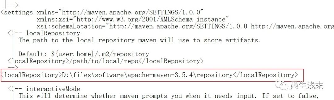 找到节点localRepository,在注释外添加<localRepository>D:\files\software\apache-maven-3.5.4\repository</localRepository>