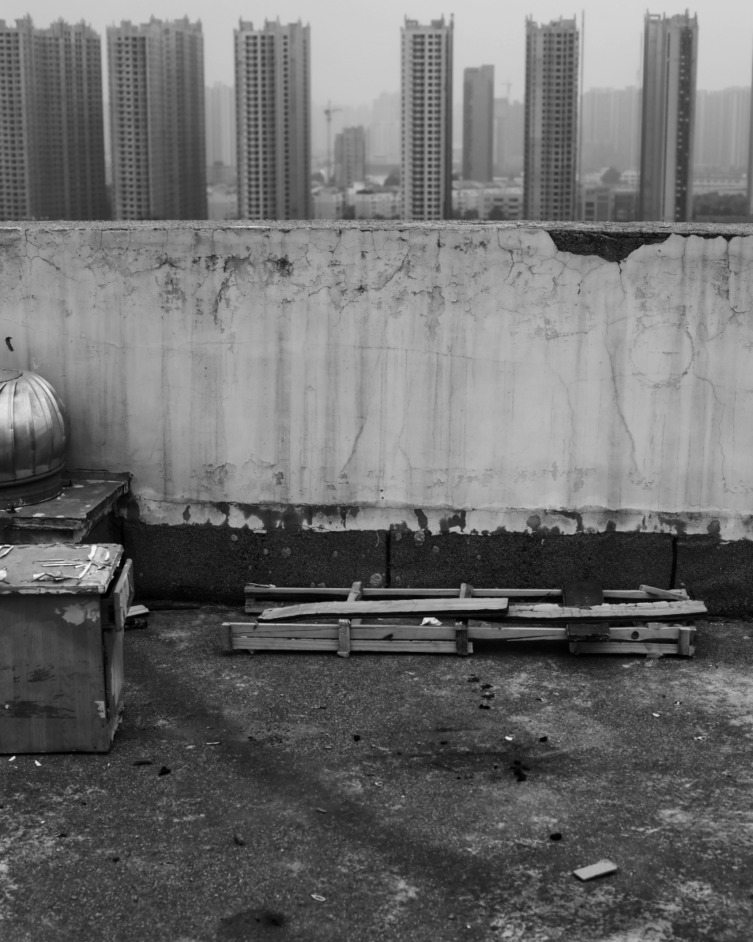 今年6月,我第二次去郑州时,张启帆要我带他上那个天台看看。他原本一身潮牌,特地回家,换了白衣黑裤。他扒在天台围墙的边缘,往下探,说,这个勇气太大了。我指给他看墙上的“我恨”,他推断浩宇留下的还有更多。他蹲下来,贴着墙壁挪动,辨认。有片水泥是新抹上去的,他试图蹭下来,看背后是什么。他还一度想翻出去看墙外壁有没有字——被我制止。天光一点点消失,我慢慢失去耐心,想这些都是徒劳的。一张床遗弃在那里,我们合力翻开了床垫,只找到写有别人名字的快递。