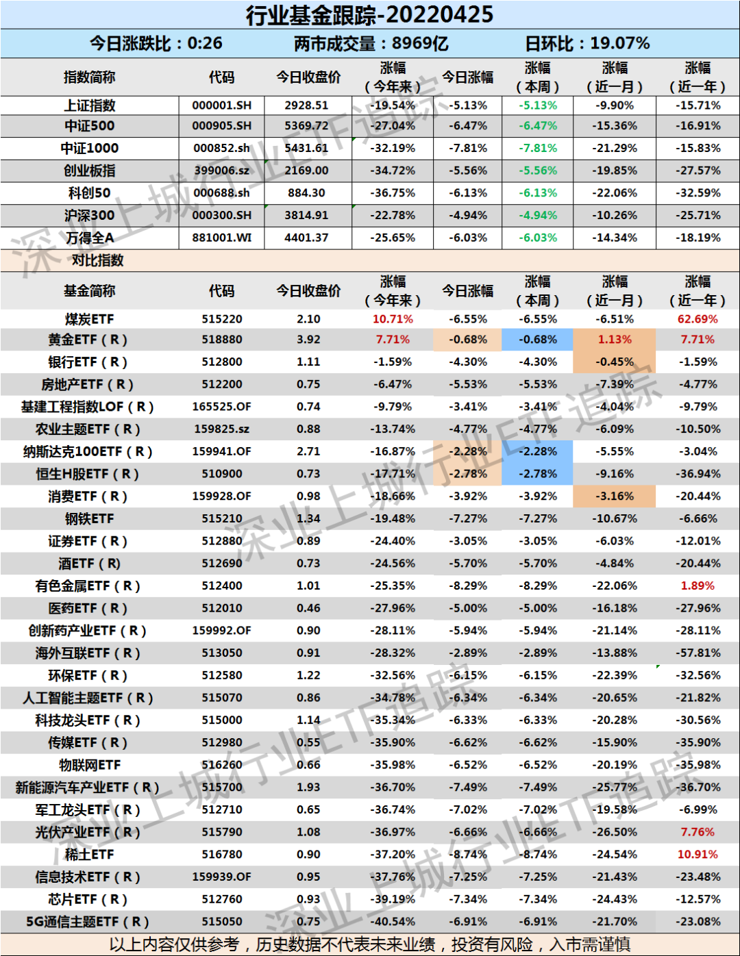 恐慌情绪一旦放大,任何基于基本面的分析,短时间内会被马上扔进垃圾桶。虽然价值终究会回归,但短期内永远不要低估极端的限度。其实不对,奥密克戎的遍地作妖,也不是一天两天的事,我们在今年年初就不知不觉进入熊市。今年以来,除了煤炭和黄金指数实现正面涨幅之外,其他所有板块,全军覆没。5G通信主题ETF下跌40.54%,芯片ETF下跌39.19%,新能源汽车产业ETF下跌36.7%,无论是成长性行业,还是传统价值股,在这惨烈的行情下,无一幸免于难。这个时候,我想起一句话:抱最好的希望,做最坏的打算。人民币对美元汇率,继续暴跌,有数据显示,一季度的在华投资降低超过35%,美联储准备加息,加息再加息,加息。结果是什么?美元升值,热钱流出,完了,还有缩表。我们已经看到,美元计数的港股资产,跌的亲爹都不认识了,中概股更是十八层地狱,腾讯又跌回330港元以下了。同样的戏码,现在开始轮到A股,从最开始的高估值赛道股,再到医疗、白酒,到现在泥沙俱下,踩踏时有发生,无数赌博玩家不得不爆仓了。可以预计,四月份,中国的经济心脏——上海,其经济数据的低迷,可能会超预期。从三月份的情况已经露出端倪。3月,上海的消费品零售总额,创23个月新低,工业增加值同比大降近11%。四月份会怎么样?可想而知。经济不及预期,封城也不知何时到头。小鹏说了,如果上海再封一个月,所有的整车都无法进行,虽然特斯拉开始复工,但是复工率,也是惨不忍睹。没有上海港口的重新开放,长三角的上游产业链,随时会有大量企业面临失血。投资,本质上是对预期的押注。而现在问题在于,满屏幕,能为良好预期提供注脚的消息,少得可怜。周末北京疫情发酵,5月初美联储缩表,人民币大幅贬值,恒瑞医药、三一重工、新华保险等机构股业绩下滑,阳光电源外部董事失联,宁德时代推迟披露2022年第一季度报告,本周又是五一前最后一周,也是一季报的最后一周,市场是雪上加霜。一句话,在时代的山呼海啸面前,个体如沙,再怎么扑腾,其效果都是要大打折扣的。放弃一步登天的幻想,正视空前严峻的现实(你不知道现在一旦失业,要找份好工作有多难),务必避免实际返贫,避免来之不易的家庭积累灰飞烟灭,广积粮、高筑墙,活下来,等风来。