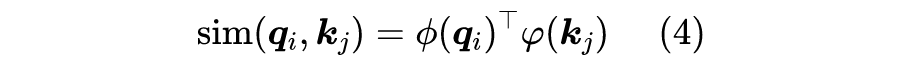 如果直接去掉 Softmax,那么就是 ,问题是内积无法保证非负性,所以这还不是一个合理的选择。下面我们简单介绍几种可取的方案。 值得指出的是,下面介绍的这几种 Linear Attention,前两种只做了 CV 的实验,第三种是笔者自己构思的,所以都还没有在 NLP 任务上做过什么实验,各位做模型改进的 NLPer 们就有实验方向了。 2.1 核函数形式
