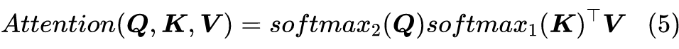 这一步我们得到一个 的矩阵,就是这一步决定了 Attention 的复杂度是 ;如果没有 Softmax,那么就是三个矩阵连乘 ,而矩阵乘法是满足结合率的,所以我们可以先算 ,得到一个 的矩阵,然后再用 左乘它,由于 ,所以这样算大致的复杂度只是 (就是 左乘那一步占主导)。 也就是说,去掉 Softmax 的 Attention 的复杂度可以降到最理想的线性级别 !这显然就是我们的终极追求:Linear Attention,复杂度为线性级别的 Attention。所以,本文的主题就是探究摘掉 Softmax 后的线形 Attention 。 问题是,直接去掉 Softmax 还能算是 Attention 吗?它还能有标准的 Attention 的效果吗?为了回答这个问题,我们先将 Scaled-Dot Attention 的定义(1)等价地改写为(本文的向量都是列向量)。 所以,Scaled-Dot Attention 其实就是以 为权重对 做加权平均。所以我们可以提出一个 Attention 的一般化定义: 也就是把 换成 的一般函数 ,为了保留 Attention 的相似特性,我们要求 恒成立。也就是说,我们如果要定义新式的 Attention,那么要保留式(3)的形式,并且满足 。 这种一般形式的 Attention 在 CV 中也被称为 Non-Local 网络,来自文章 Non-local Neural Networks [4] 。