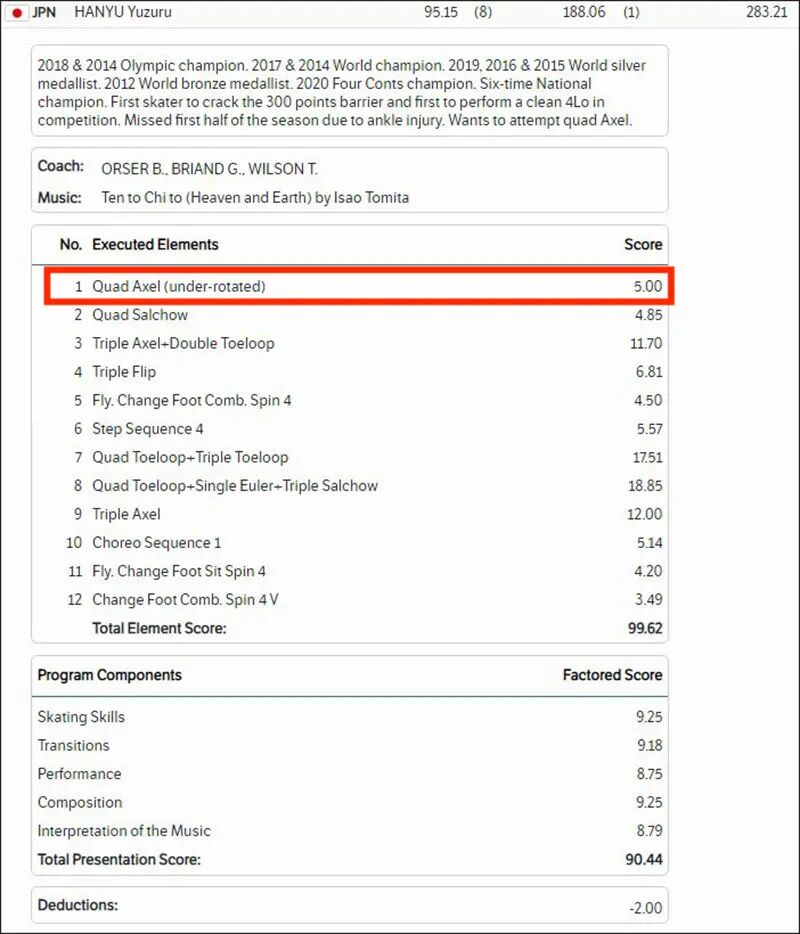 在赛后的裁判打分表上,羽生结弦的这一动作出现了“4A<”的字样,意思是周数缺失,被判定为旋转不足(under-rotation),基础分为10分。