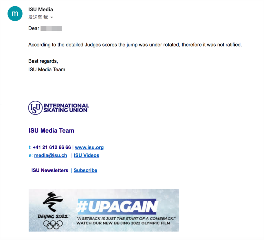 2月11日,国际滑冰联合会(International Skating Union,ISU)回复“有据”提出的“国际滑联是否对羽生结弦的阿克塞尔四周跳进行了史上首次认定”的问题称: