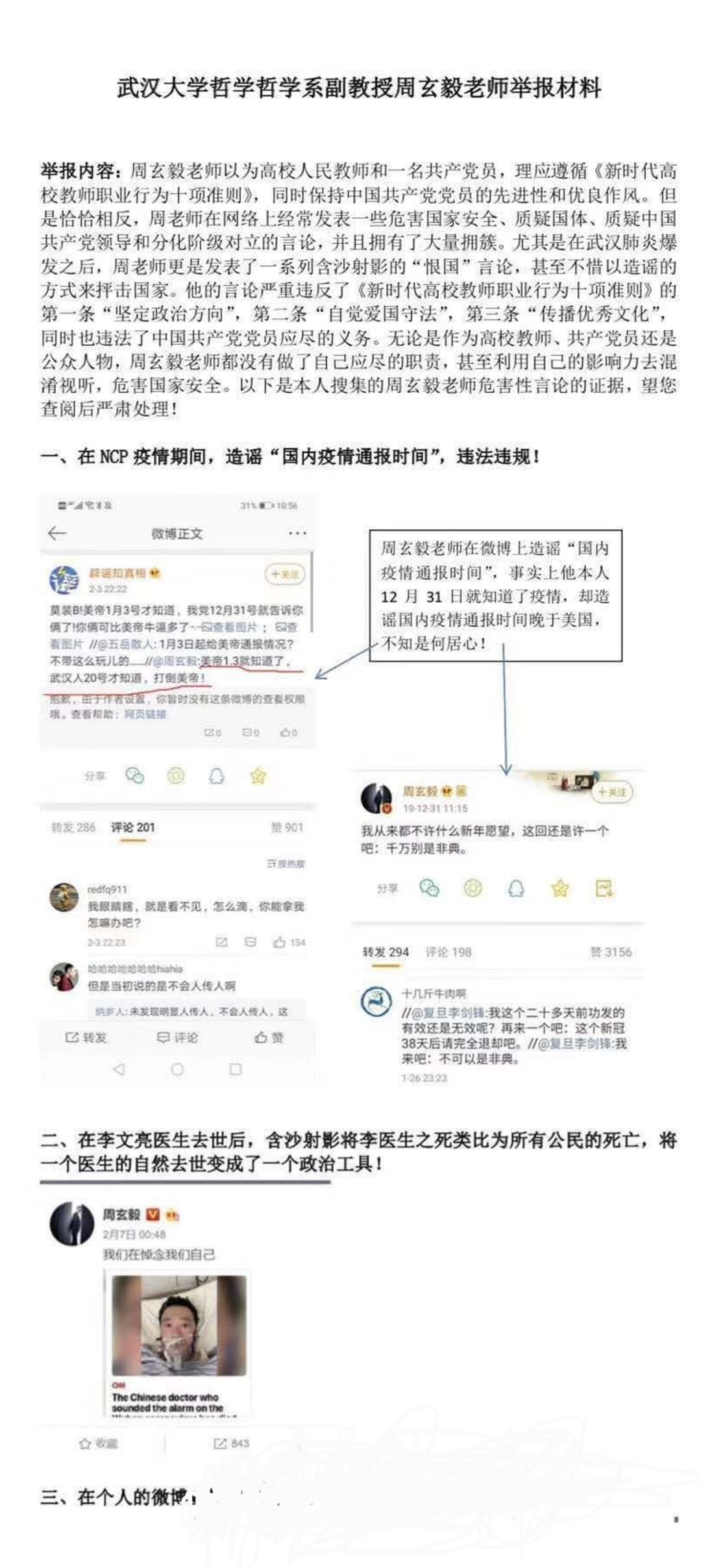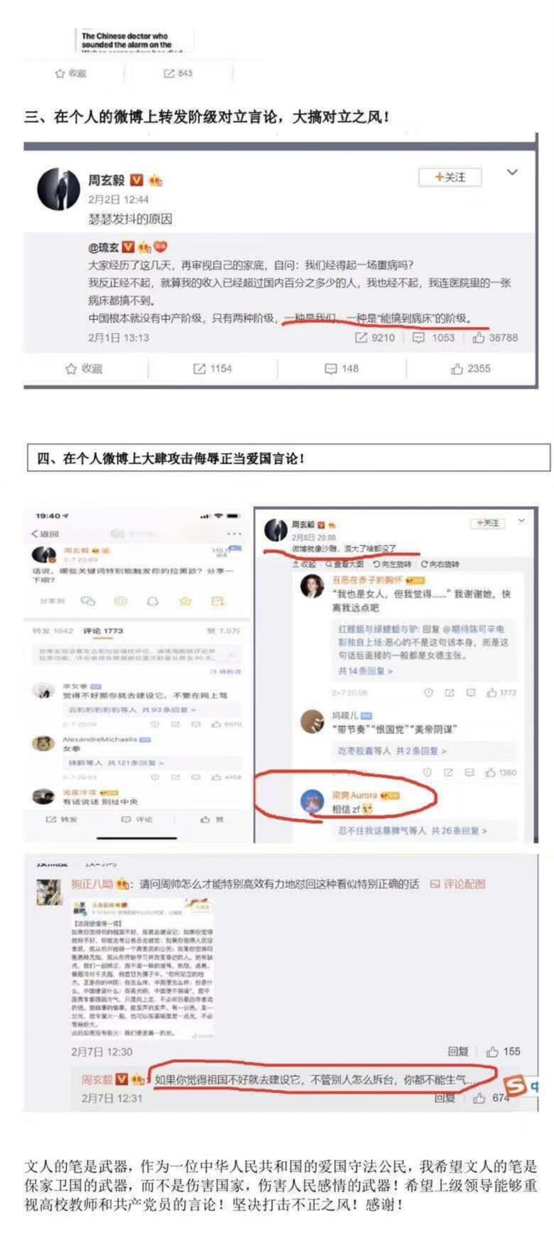 周玄毅老师在12月31号发的微博:“我从来都不许什么新年愿望,这回还是许一个吧:千万别是非典。”并在转发其他微博评论中说:“美帝1.3就知道了,武汉人20号才知道,打倒美帝。”