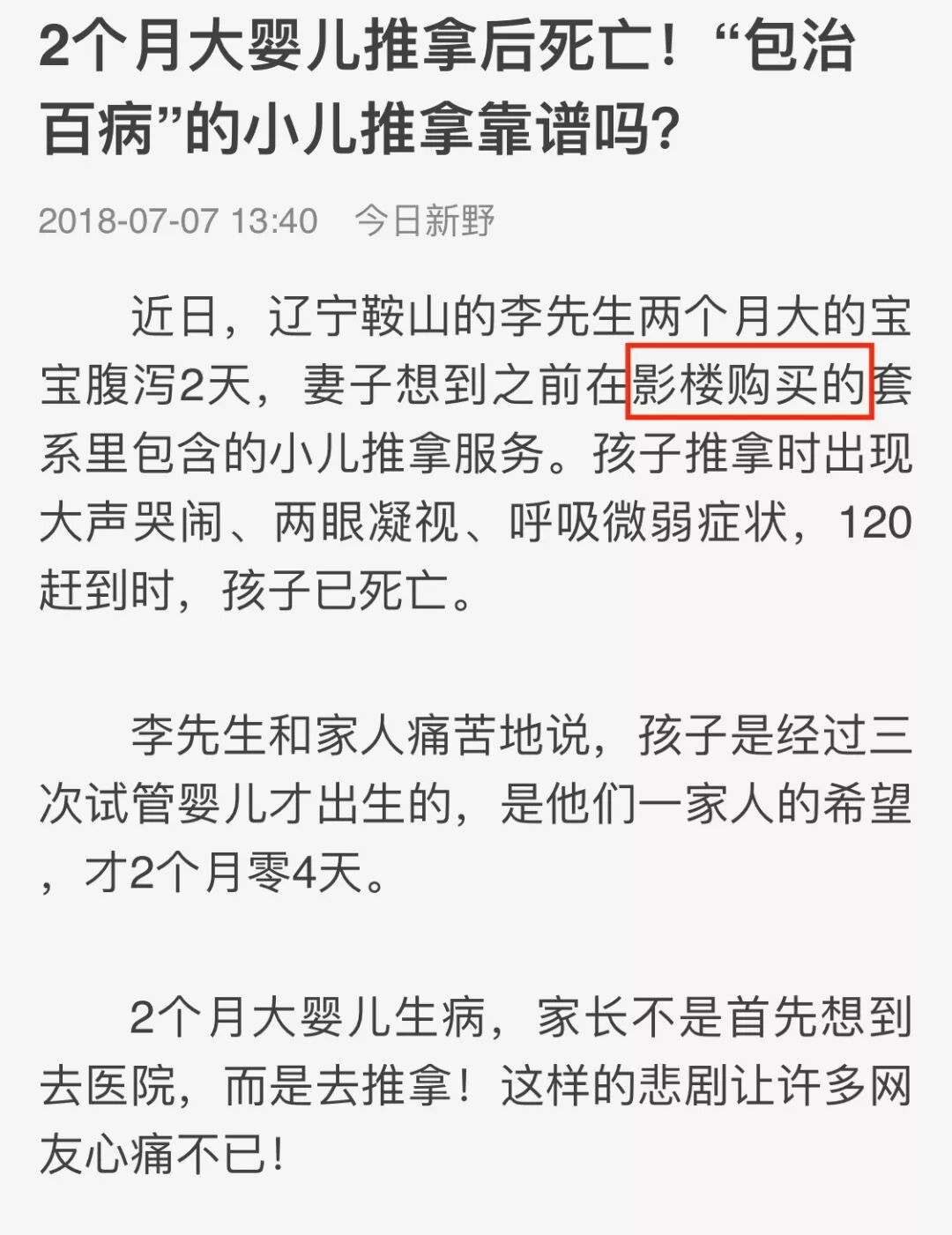 这个孩子是推拿导致死亡的吗?从新闻的报道里看不出来,从实际的逻辑来看,在体表的捏捏揉揉,除非动作实在太过粗暴,否则造成外伤或死亡的机会很低。