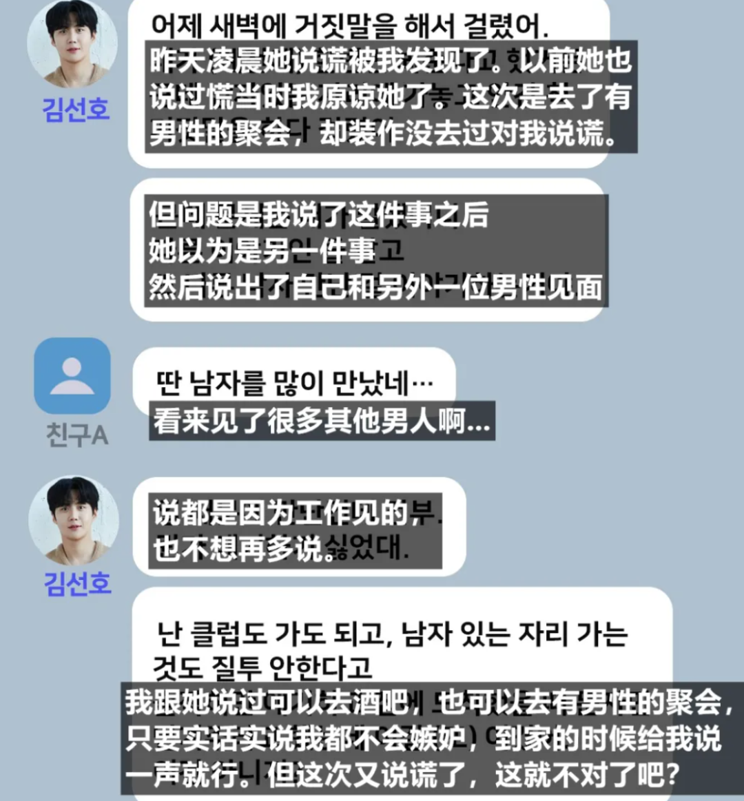D社还放了这个综艺截图来佐证,这是金宣虎那段时间在节目里的发言,“我会做海带汤,前不久刚做了海带汤。”D社表示,金宣虎其实是因为女方多次在外面约见异性,才跟她分手的。报道里还附了一篇女方给金宣虎发的道歉小作文:“对不起我把事情搞成这样,宣虎啊,我用爱你的借口合理化了对你的谎言,是我做错了。”还附上了金宣虎跟他朋友A的对话:金宣虎跟朋友抱怨道,前一天凌晨自己发现女友跟别的男的去约会了,还向金宣虎隐瞒事实,被他责问起来的时候,又不小心说自己跟另一个男性见面了......女方的熟人甚至也指控女方,觉得金宣虎明明对她挺好的,是她自己不对:“圣诞节时金宣虎给她买了700万韩币的名牌包,平时也基本不用她付钱的。”我说什么来着,这事儿确实有点抄袭霍尊的澄清剧本了。