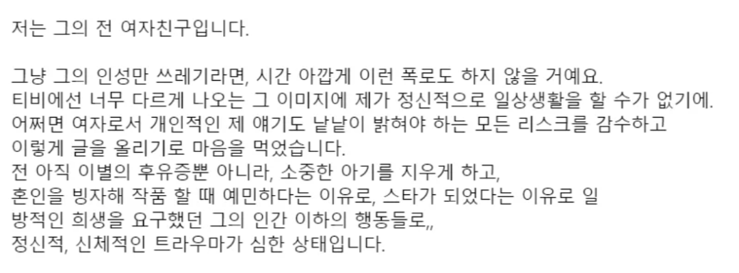 但是大家都知道,男演员占了花期长的便宜,发力晚点也没啥。《百日的郎君》和《Start-Up》里,金宣虎当了两回男二,发挥不错,之后就在大热综艺里争取到了个固定位置,开始靠暖男形象刷脸了。今年的《海岸村恰恰恰》,他就顺利爆了,眼看着演艺事业一片坦途。自称是金宣虎前女友的人,上周在论坛写了篇旷世长帖,说金宣虎根本不是暖男而是渣男。首先,金宣虎在女友身体不好的情况下就是不带套,还用安全期的借口来糊弄她。女方意外怀孕之后,即便医生说如果强行堕胎以后可能会怀不上孩子,金宣虎也没打算负责,用结婚的诺言哄她堕胎,“否则会影响我的事业,要赔广告商7亿呢”。果然男方极其重视事业,连引产手术当天都没出现,是朋友全程陪同女方去的。金宣虎从头到尾就出了200万韩币打胎费,一分没多掏。这位前女友还表示,金宣虎自从火了之后就变了,本来承诺她年底就一块去旅行,但之后就鸽了,说自己变红了太忙没时间。