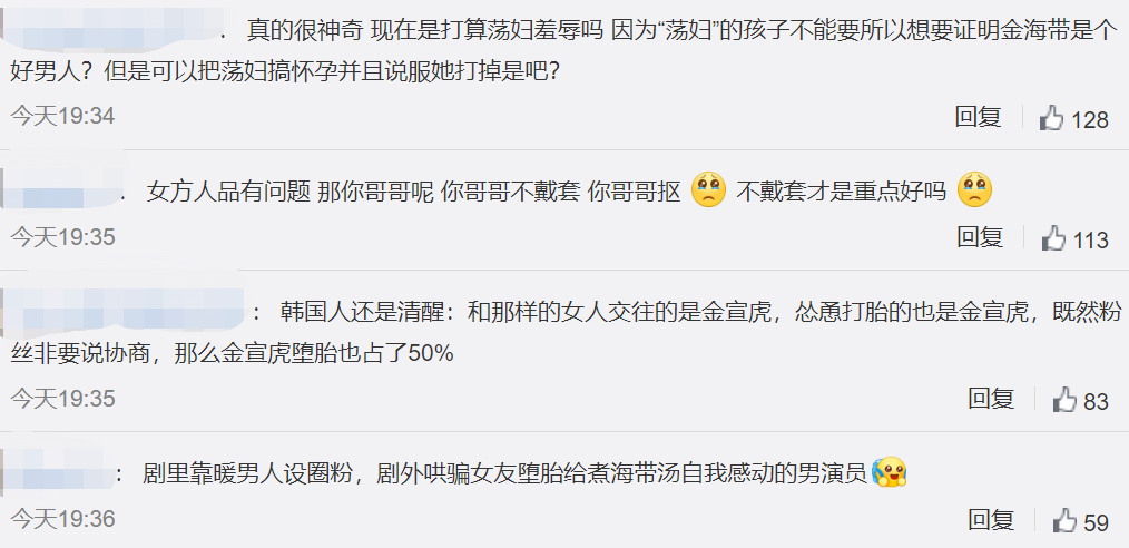 女方感情不忠贞出轨是真,男方拿事业让人女方堕胎也是真啊。我还以为女方全篇都在说谎呢,结果D社说俩人是协商后才堕胎的,所以反转了。我:excuse me?堕人家肚子里的孩子本来也得打招呼吧?让人怀了孩子又给堕下来,事后就还能重新做好男人,咋,煮的那几碗海带汤镶金啦?评论里的这段话话糙理不糙:女方是渣女没错,但选择跟这样的女的在一起的是金宣虎,不带套的是金宣虎,让人家打胎的也是金宣虎啊。昨天又有不少网友冒出来感慨,“我就知道我看到的是真的他”,emmm总感觉这教训有点白吃了......