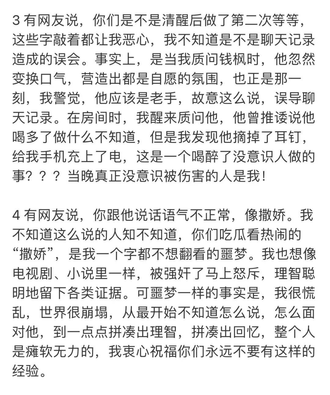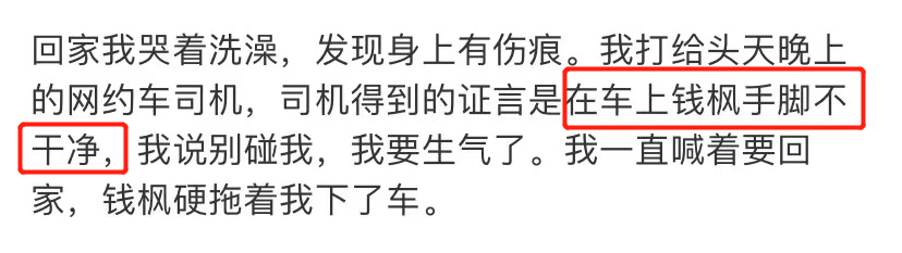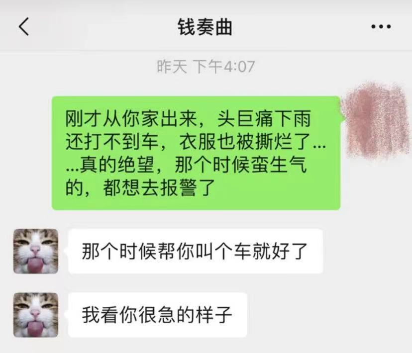 3、一直到2019年2月14日,钱枫以及他的几个朋友约她在一家小酒馆吃饭,这是两人第一次线下见面。4、当晚钱枫劝她喝了很多果酒,吃完饭后还提议去KTV。第二天,她就一丝不挂地在钱枫的房间里醒来了。小艺表示:事后,面对自己的尖叫,钱枫解释说,是她喝醉了吵着要跟他回家,他喜欢她,所以不得不带她回家,最后没忍住发生了关系。但是小艺po出的聊天记录显示:第二天小艺穿着被撕烂的衣服离开钱枫家时,钱枫并没有送她,而且小艺当时很生气↓小艺说:自己回家后,发现身上有伤。之后,她打电话给当天晚上的网约车司机了解两人在车上的情况,司机表示“钱枫在车上手脚不干净”。小艺表示:之后,自己回到了钱枫所住的小区,调出了监控,发现自己当时已经神志不清,几乎是连拉带拽被拖进房间的。