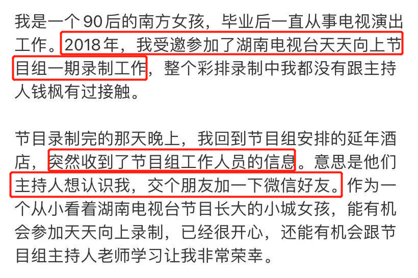 昨天下午,网友“小艺希望坏人被惩罚”(下文简称“小艺”),发布了一条长文,举报湖南卫视主持人钱枫强奸↓在长文里,小艺除了举报以外,还表示:可以对所述内容承担法律责任,并且一定全力配合警方调查↓