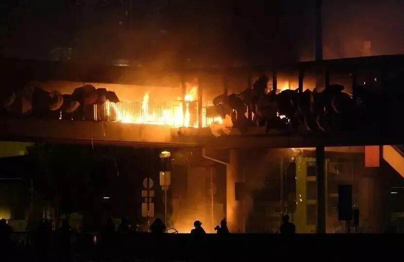 17日晚,也就是“新老一哥”交接前夜,香港暴乱再次升级。暴徒占领理工大学并极尽暴虐之行,不仅将学校设施破坏殆尽,更焚毁了理工大附近的行人天桥,并引发爆炸。随后,他们又用燃烧弹焚烧了一辆警方的锐武装甲车。