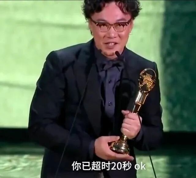 一上台,他先拿出手机给奖杯拍照。然后啰啰嗦嗦讲一大堆,等到进入正题,致辞时间也到了。