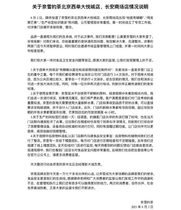 8月4日,奈雪的茶官方微博发布消息称,各地政府监管部门已对全国186家门店(全部店数603家)突击检查,抽查结果合规合格,未发现有报道中提及的“地面有蟑螂”“用发黑芒果”“生产标签标识错误”等问题。