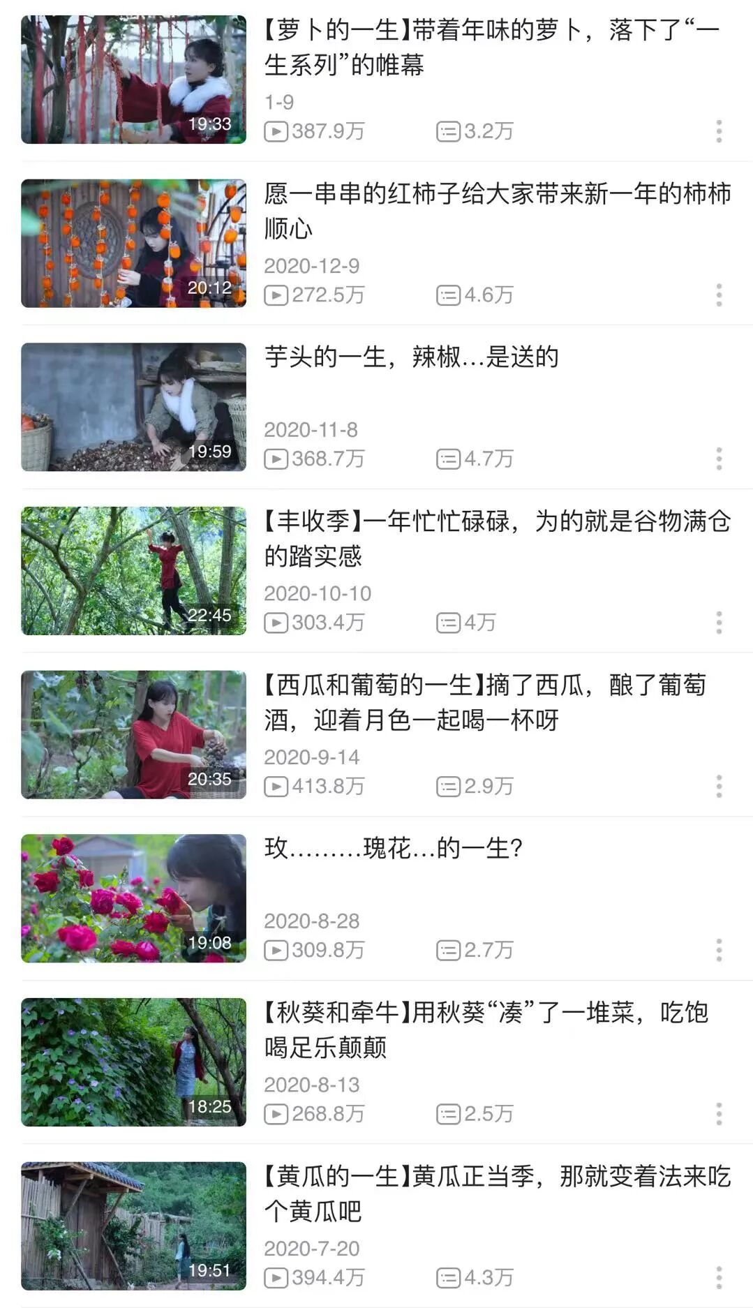 她的视频拍摄时间跨度很长,尤其是“一生系列”——“土豆的一生”“萝卜的一生”“黄瓜的一生”“玫瑰花的一生”……从播种到收获再到做成美食,需要跨越两季甚至三季。因此,她发布视频的频率并不是特别高,8月份没更新视频也并不显得扎眼。