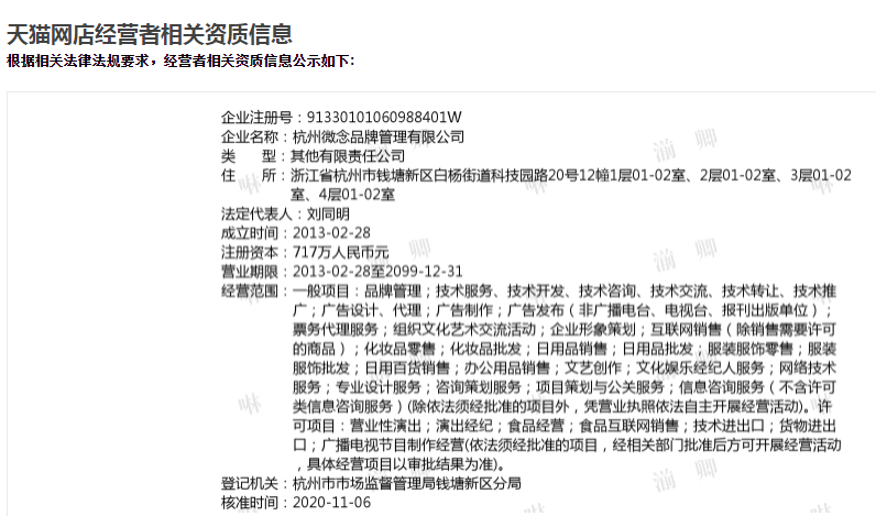 ·李子柒天猫旗舰店的企业主体是微念,法人是微念创始人刘同明。