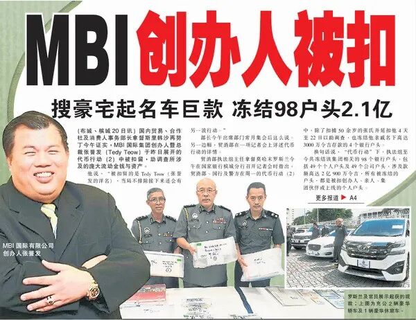 当时,执法组冻结了“MBI”集团相关的98个银行户头,涉及款额超2亿林吉特。