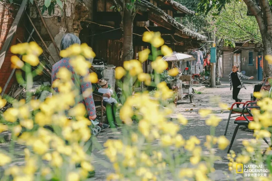 春天里的油菜花开在巷子旁的一小块地里。