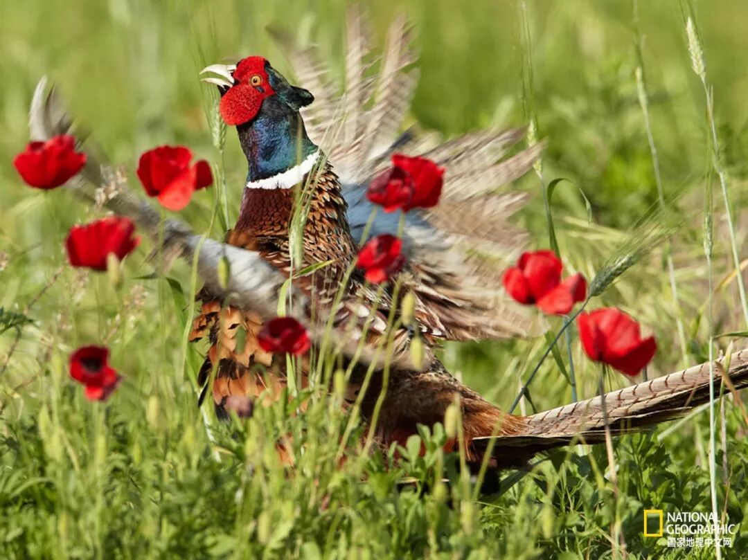 意大利罂粟(poppy)花丛中的一只野鸡。