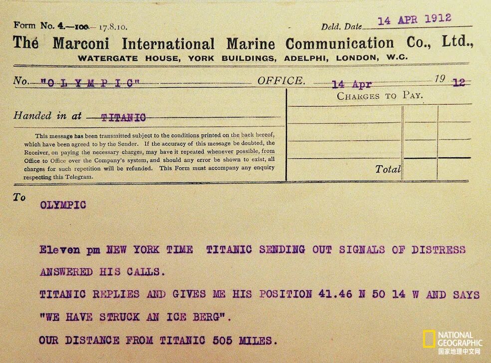 泰坦尼克号发给奥林匹克号的电报,称其撞上了一座冰山。