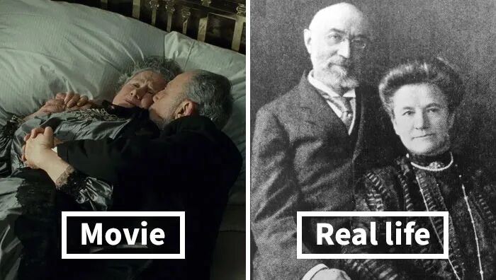 影片中恩爱赴死的老夫妻有真实来源——Isidore Strauss和Ida,据报道,他们俩都选择留在船上,丈夫想让妻子自救,但Ida说:“我们一起生活这么多年,你在哪里,我就在哪里。”