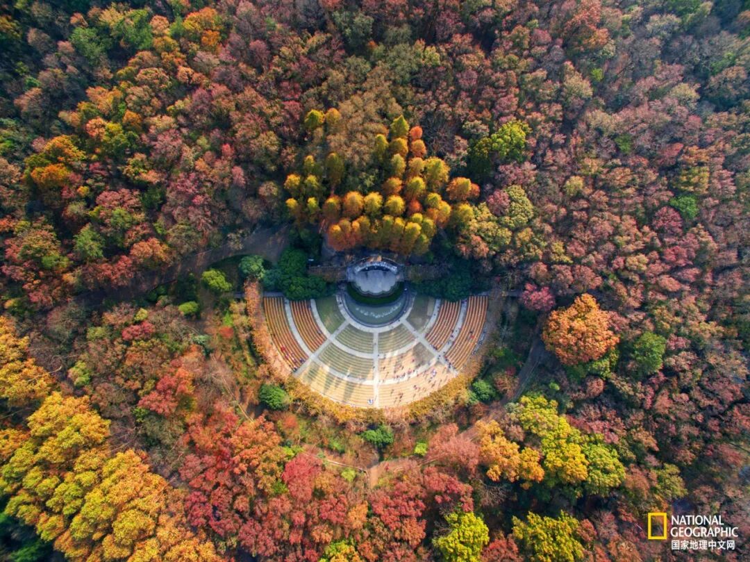 俯瞰紫金山的路,秋天的树林犹如绽放的礼花。