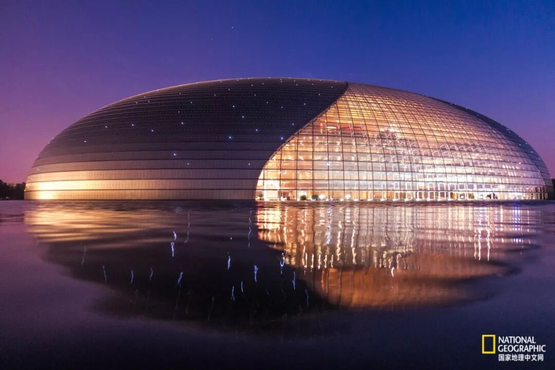 在水面上的北京国家大剧院因为水的反光,使固体的建筑有了灵动柔软的一面。
