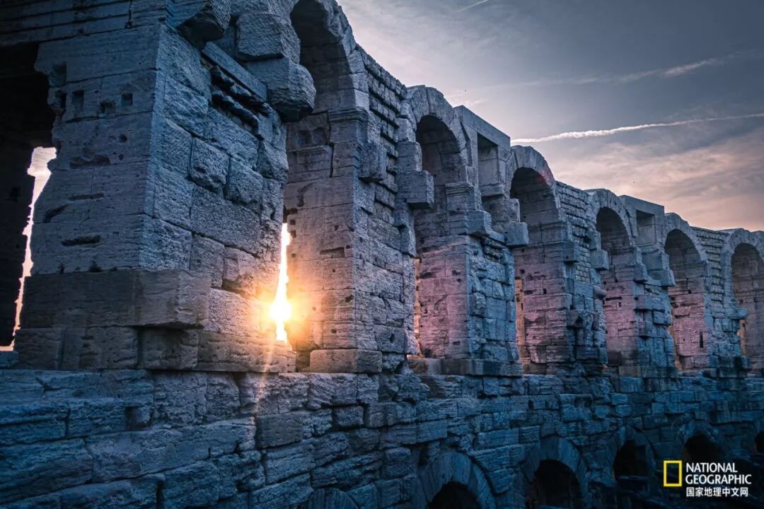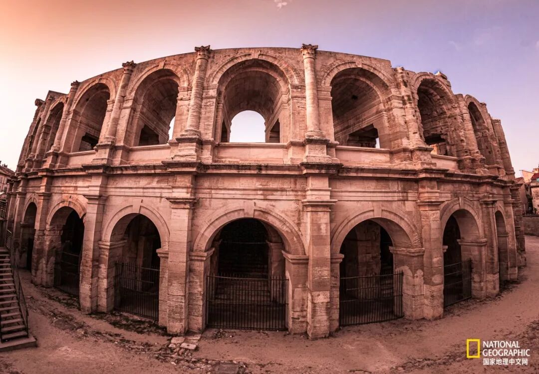 7月一个炎热的早晨,我混进法国阿尔勒古罗马斗兽场时天还亮着。1900年之前阳光的位置和今天并没有什么区别,早期2层的双拱门结构和顶部墙体以及顶棚已经破坏。拱门不仅是受力结构,也是装饰,拱券内陈列的神像迎接着每天的阳光。