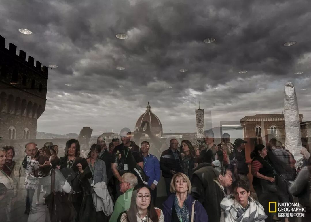 我站在佛罗伦萨乌斐茨美术馆楼顶天台,看到天空的阴云,对面的建筑,也看到人们在玻璃窗内向外张望的神态。