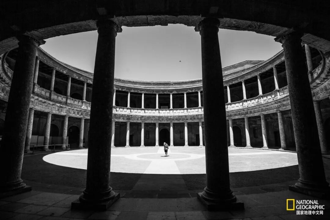 在西班牙拍摄的环形古老建筑的内部,站在中心的游客完美地衬托了建筑的宏大。