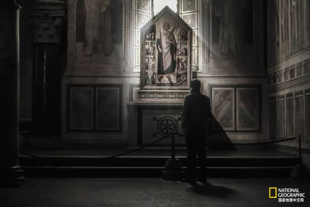 意大利佛罗伦萨的百花大教堂,一个黑暗中的祭坛部分被设计成光芒万丈背景。