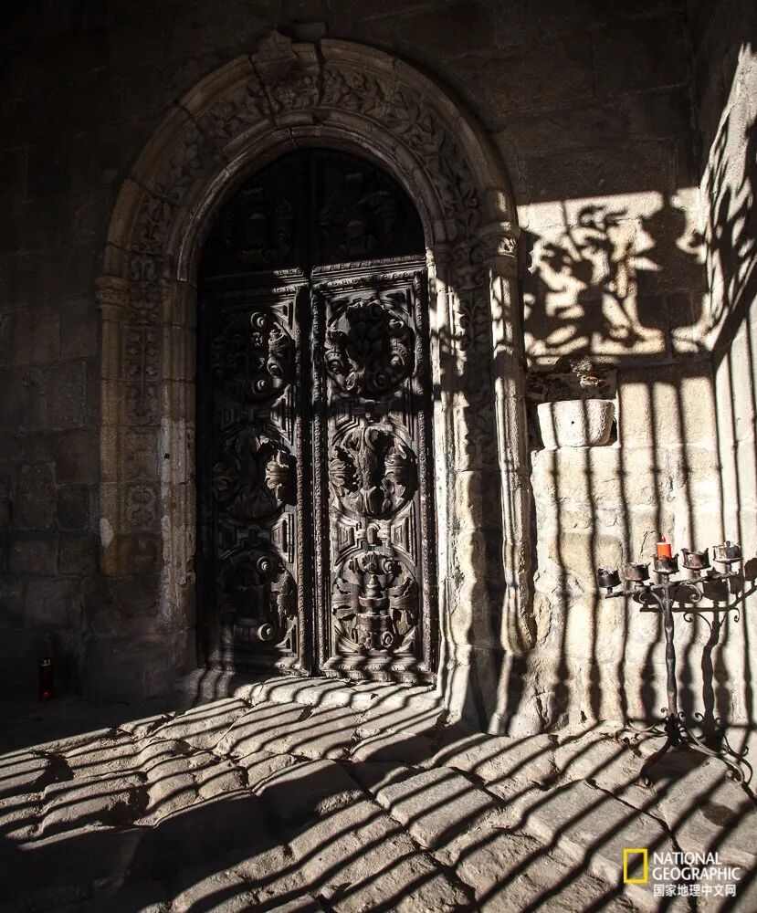 在葡萄牙的波尔图老城区的一个教堂前,拍摄落日前光线将铁门的复杂花纹投射在古老建筑表面的优美瞬间,时间是缓慢的过程。