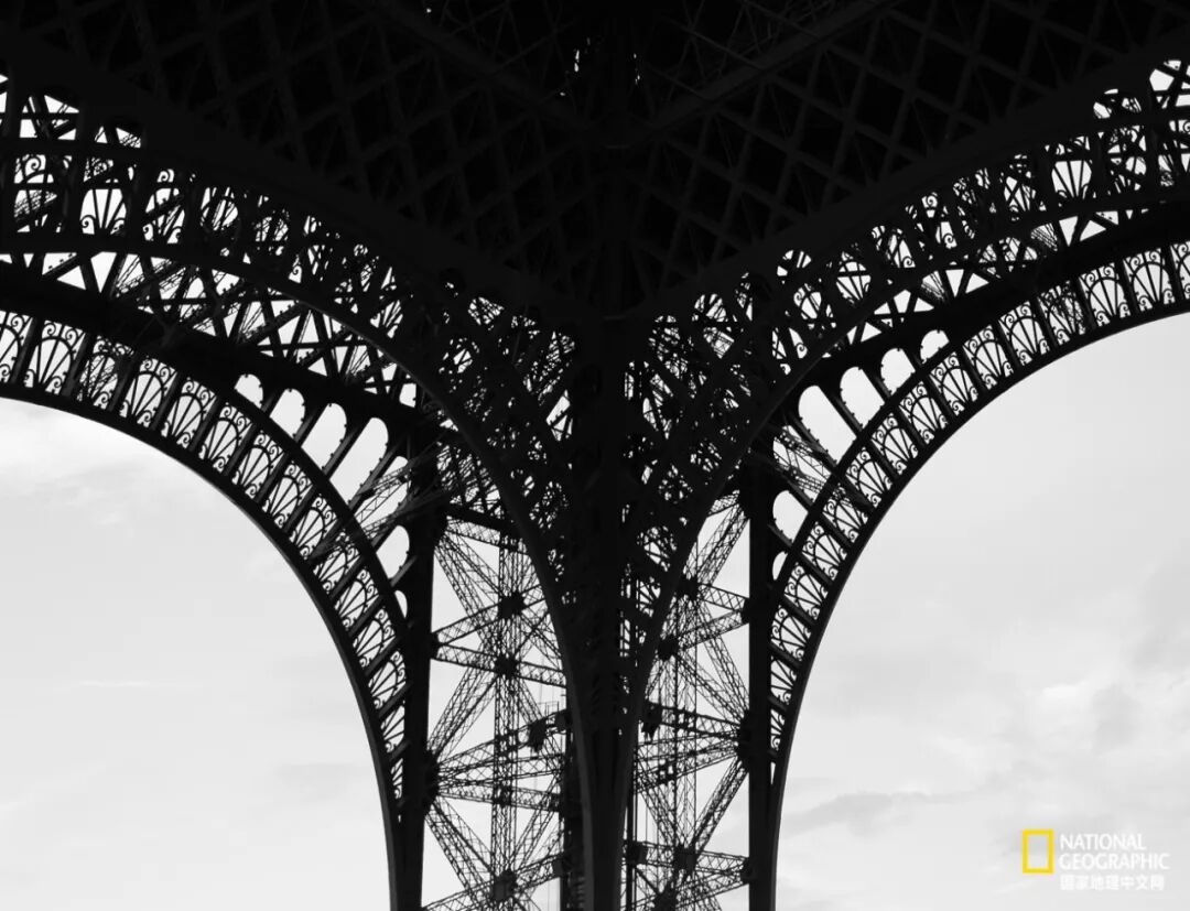 在巴黎,没有什么比一条三角裤更有诱惑力了。在白色天空背景上,铁塔的底部局部完美呈现了一个建筑的局部。