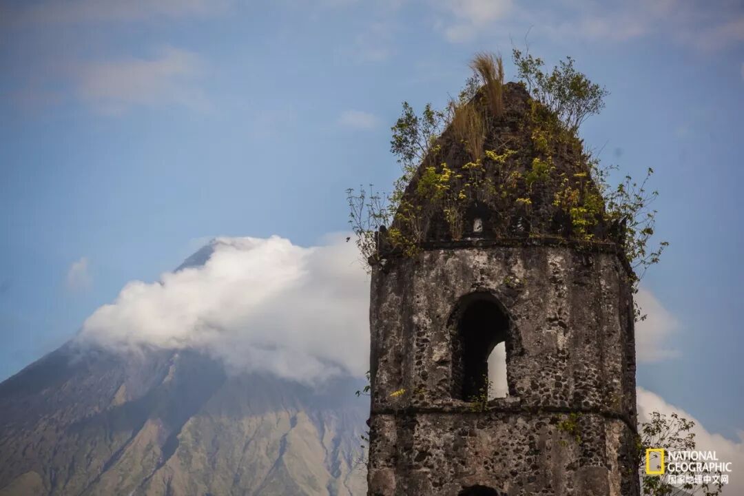小光圈的另一个好处就是靠长焦镜头可以将背景和前景之间的距离缩短,在菲律宾马荣火山前拍摄教堂和远处火山时候,似乎危险近在眼前,但是这只是错觉。