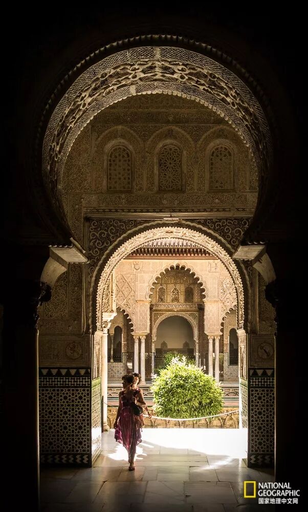 西班牙格林纳达的阿罕布拉宫,墙壁上留下的繁复图案凝聚了伊斯兰艺术的精粹。拍摄的过程中还应将建筑本身的环境融入其中,使得这些细节具有宏大的背景。
