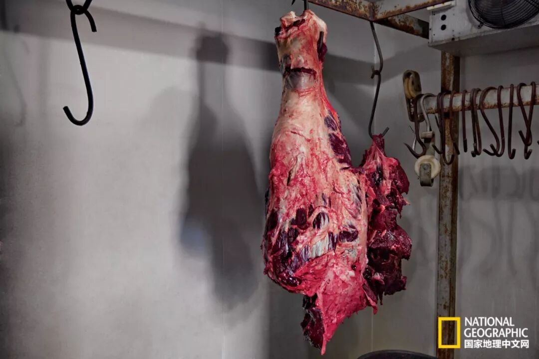 在私人游猎场结束狩猎后吗,猎人将一大块白犀牛肉挂在冷库里保存,而工人们则用岩盐对犀牛皮进行处理。