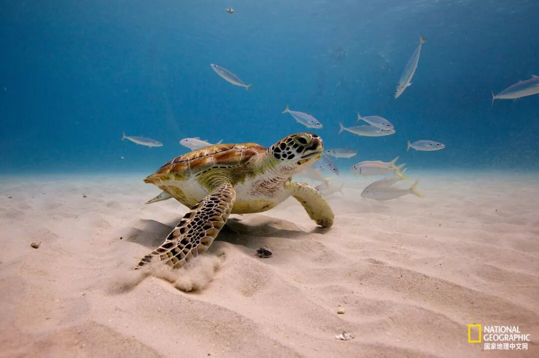 几年前,我带了一整套潜水设备到巴巴多斯度假。每天都有游客坐船来看这些乌龟,所以它们变的非常温顺,我也有了给它们拍照的机会。我喜欢这张照片的宁静感。乌龟和鱼都很放松,才有了这幅安宁的画面。