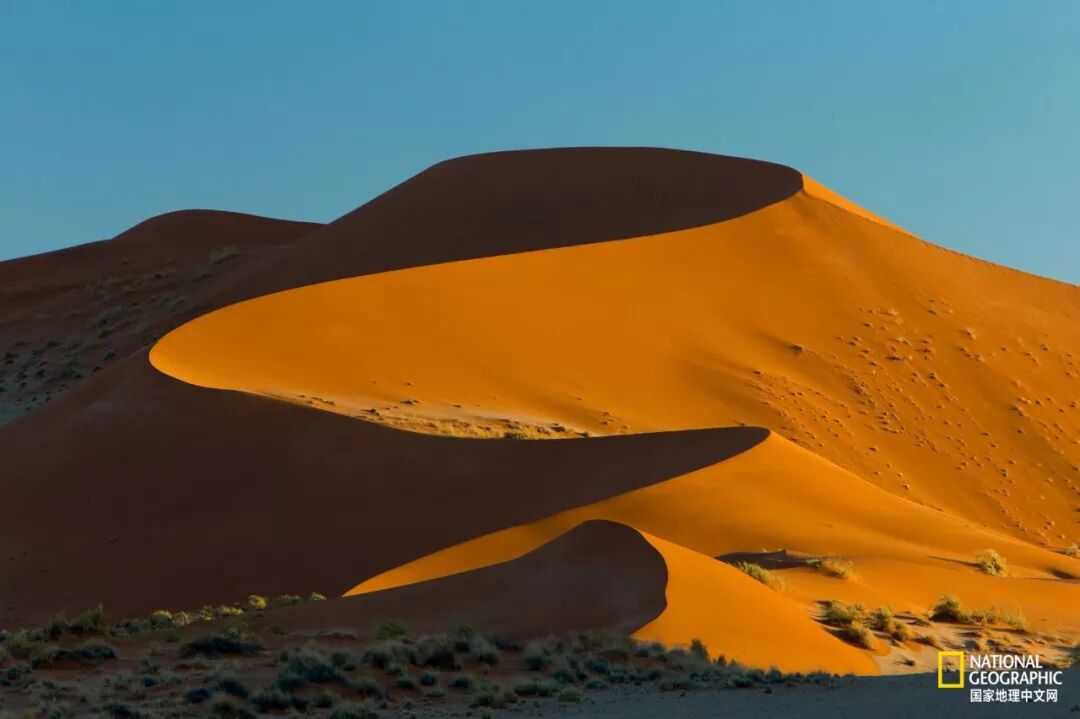 白天驾车在沙丘间穿行,夜晚则在沙丘下露营。我爱沙丘的纹理,从远处看去,好似丝绸般柔顺,起起伏伏,曲线柔和。我之所以喜欢这张照片主要是因为光线。沙丘本身的形状很美,傍晚的光线造就了平衡的构图,画面被分为了两半。