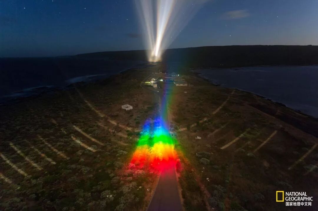 好在夜幕降临后,探照灯开始启用,彩虹随之出现。每7.5秒,探照灯的灯光就会扫过棱镜,把美丽的彩虹投射到远方。