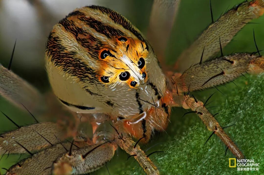 法国昆虫学家安托万·弗兰克合成了这张雌性山猫蜘蛛(Oxyopes dumonti)的图片。这种蜘蛛不结网捕食;它们视觉敏锐,常伏击猎物。