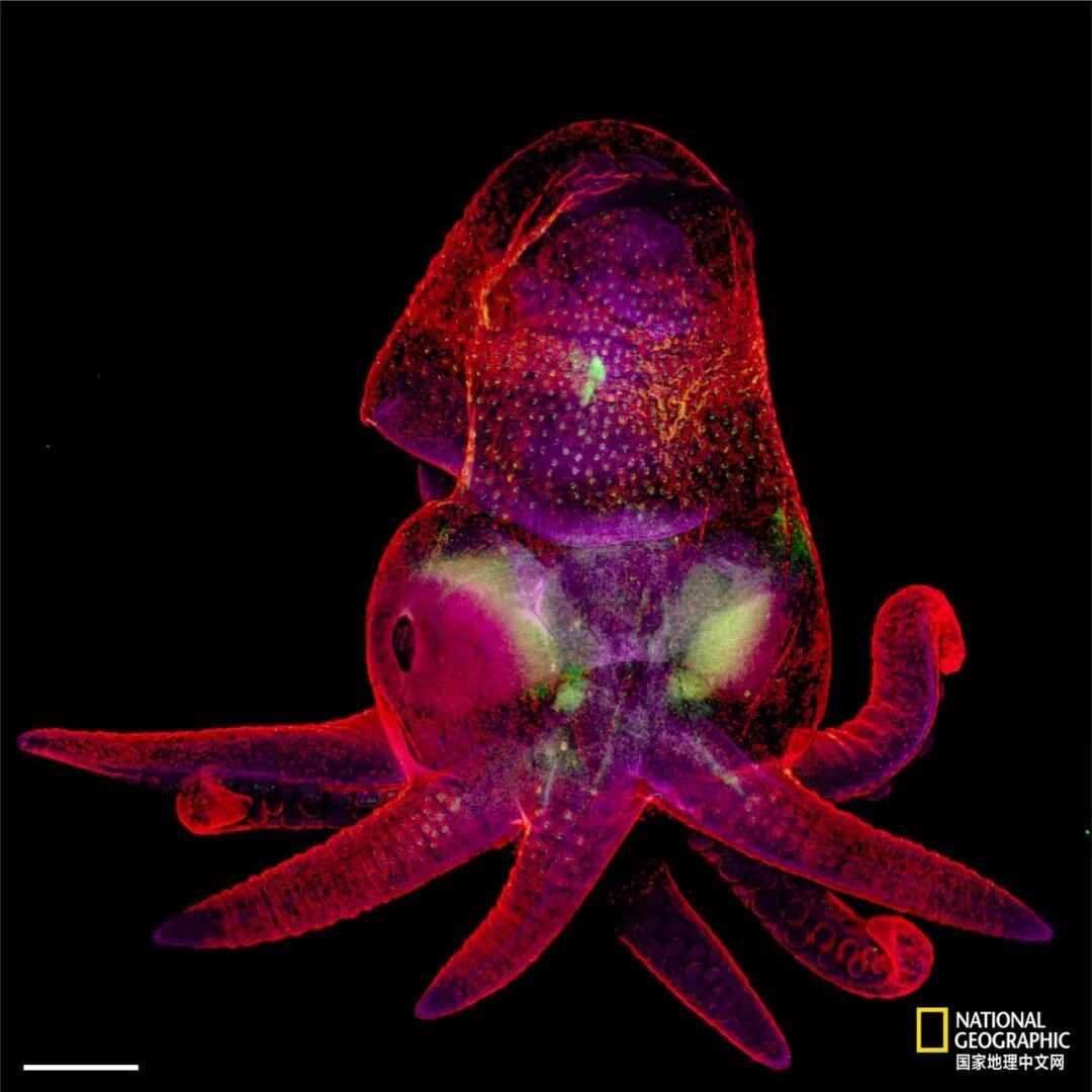 牛津大学的研究人员马丁娜·卢卡舍维奇和卡丽·阿尔贝丁将若干照片堆叠在一起,合成了加利福尼亚双班蛸的胚胎图像。