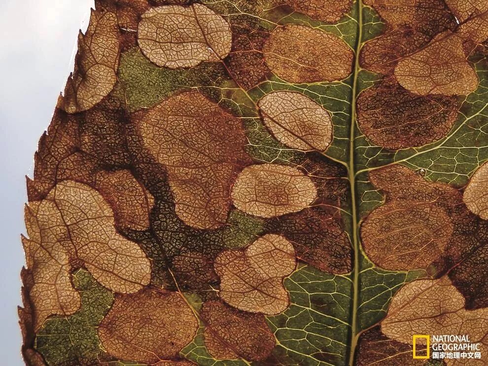 在美国纽约福里斯特希尔斯的一条街的树上,莱西卡发现了样子很奇特的叶子,他举起其中一片对着太阳,拍下叶面上的图案与色彩。
