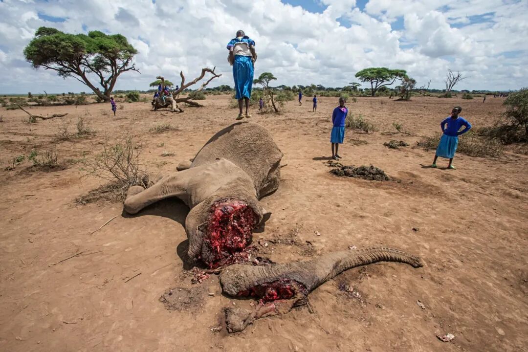 乞力马扎罗山西北,肯尼亚与坦桑尼亚交界,一个马赛女孩在一头52岁母象尸体上蹦跳。这头大象因闯入粮仓偷食而遭投毒致死,象牙也被拔掉。