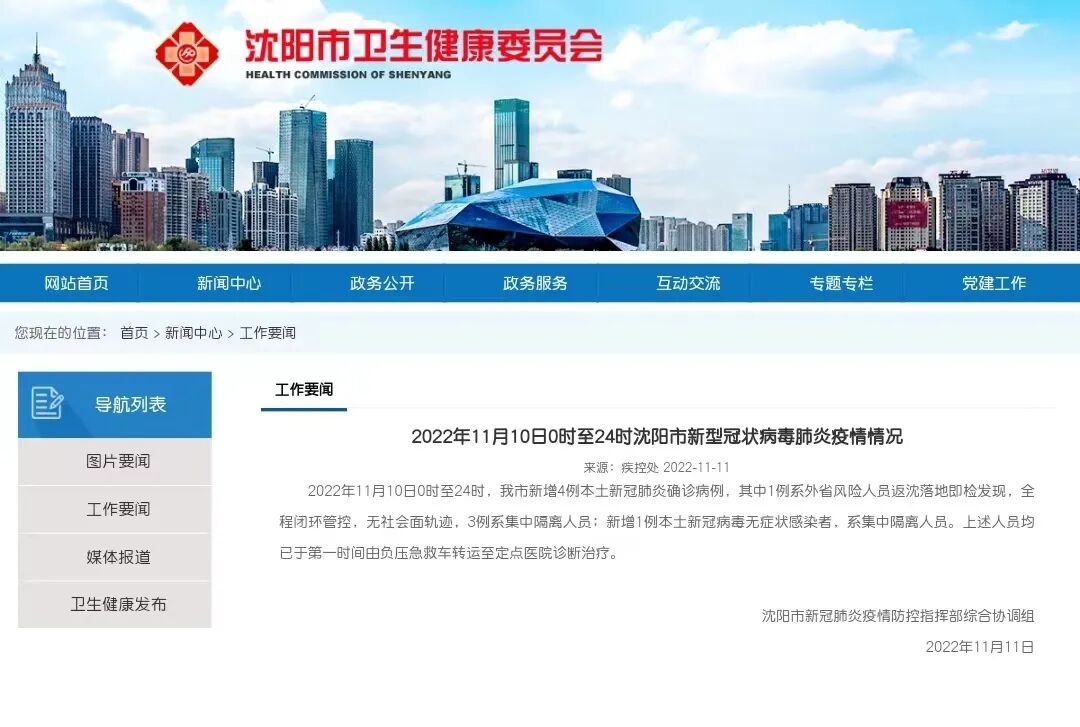 2022年11月10日0时至24时,我市新增4例本土新冠肺炎确诊病例,其中1例系外省风险人员返沈落地即检发现,全程闭环管控,无社会面轨迹,3例系集中隔离人员;新增1例本土新冠病毒无症状感染者,系集中隔离人员。上述人员均已于第一时间由负压急救车转运至定点医院诊断治疗。